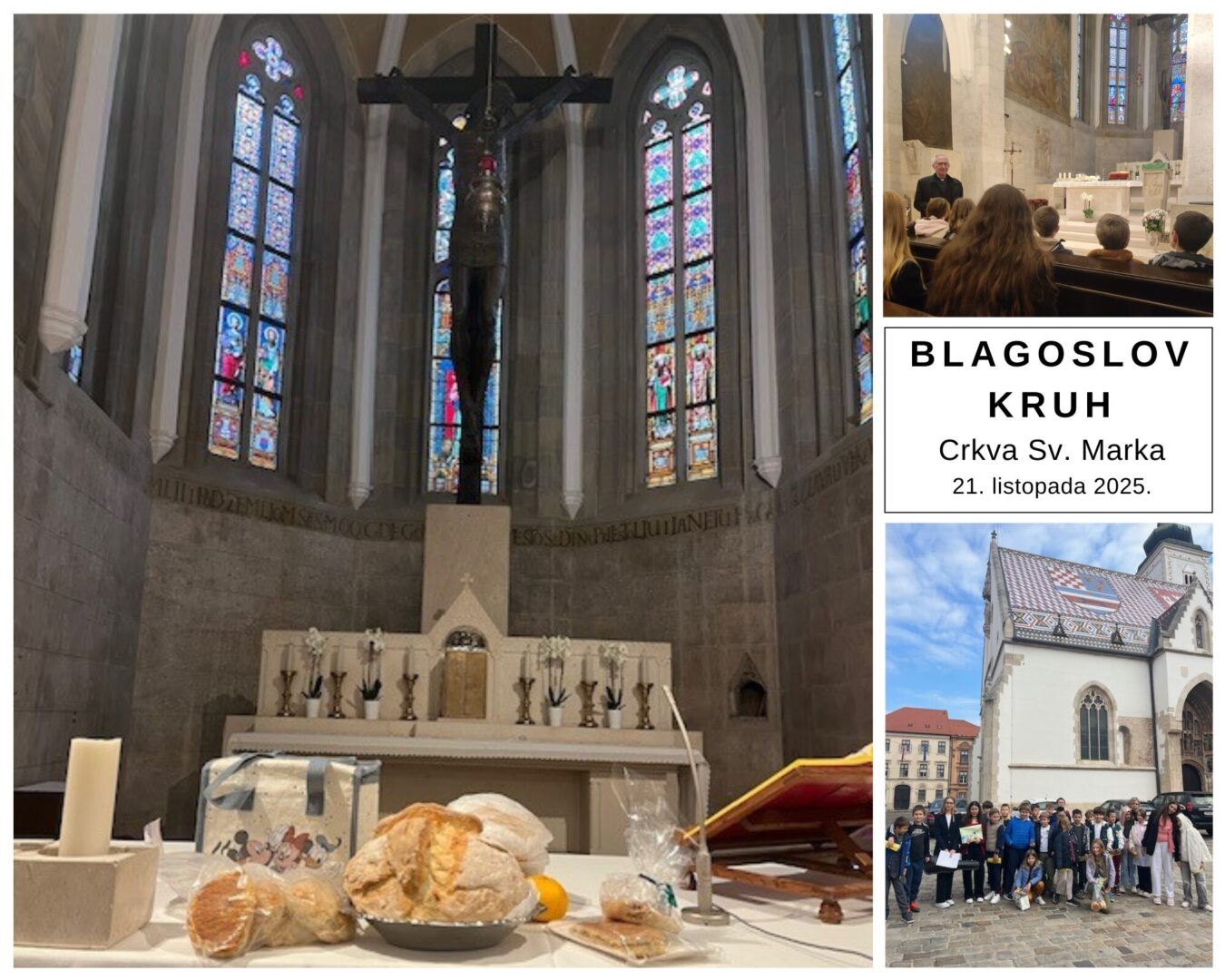 Ove školske godine su učenici trećih razreda koji pohađaju Katolički vjeronauk, te tri učenice viših razreda odnijeli u crkvu Sv. Marka kruh i pecivo na blagoslov. Učenici su tom prigodom izveli kratak program: otjevali su pjesme: “Da mi je biti sunce” i “Marijo, o Marijo”, dok su učenice viših razreda izvele glazbenu točku na violinama (Bela Ferenac 7.b, Milena Ćepulić Petković 7.a), a učenica Sonja Devide 7.a. je izgovorila recitaciju o kruhu. Na kraju je župnik Vladimir Magić blagoslovio kruh koji smo zatim podijelili u blagovaonici škole. U pratnji su bile profesorica Anita Vidović, asistentica Barica Reil i vjeroučiteljica Iva Dorić.