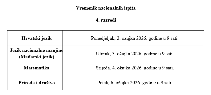 Tijekom ožujka provodit će se nacionalni ispiti za učenike svih 4. i 8. razreda osnovnih škola u Republici Hrvatskoj. Učenici četvrtih razreda ispite pišu iz predmeta Hrvatski jezik, Jezik nacionalne manjine (Mađarski jezik), Matematika te Priroda i društvo.
